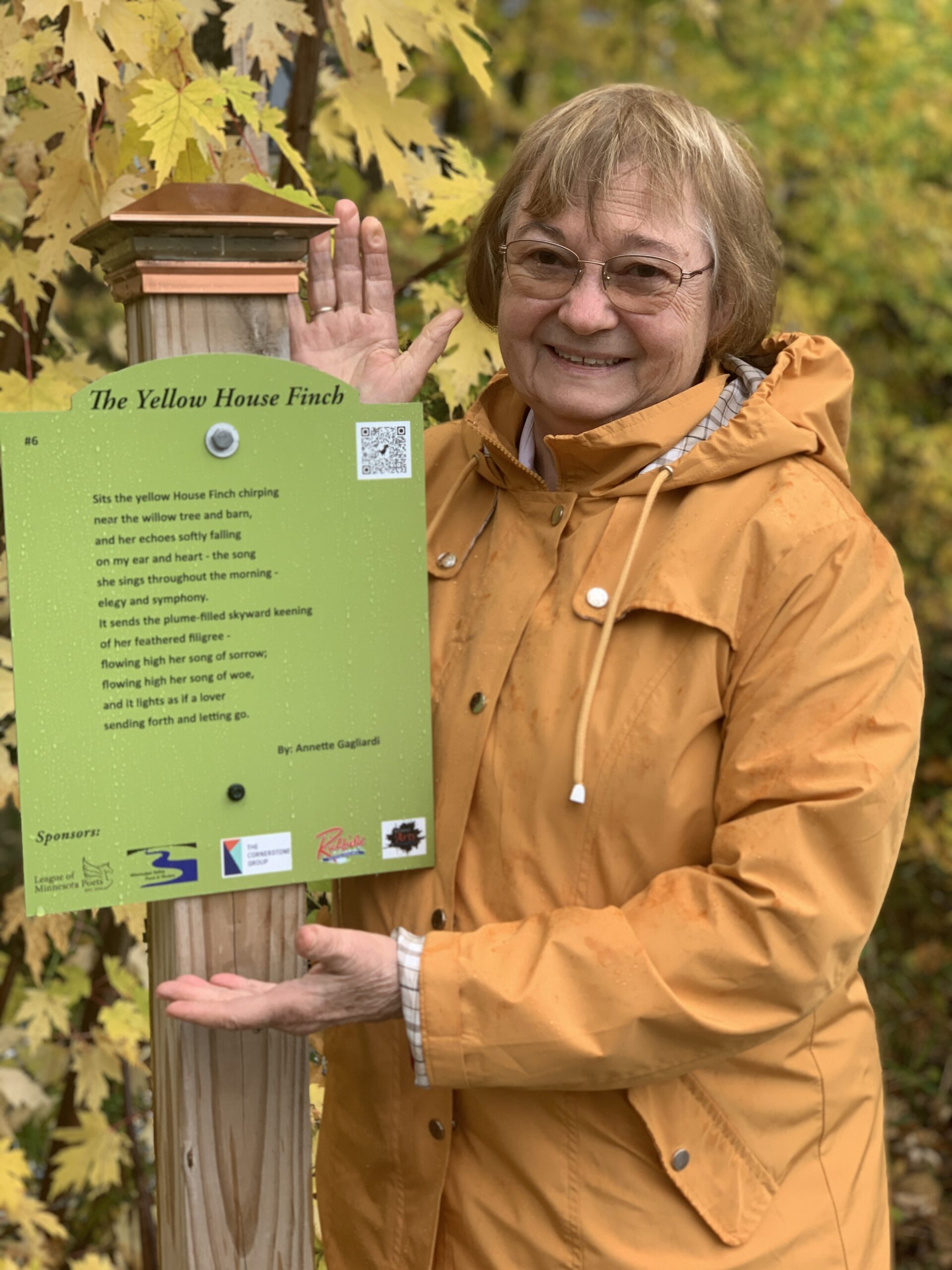 As a poetry contest winner, my poem, Yellow House Finch, is published and displayed in the Nature Area Poetry Walk at Richfield Lake Park through the Mississippi Valley Poets & Writers. It will be posted 2025-2027. This poem, along with nine others, will be displayed along the walking path for two years. Nature Area Poetry Walk at Richfield Lake Park is located on 64th and Lyndale. Hope you come out for a walk and enjoy!